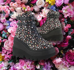 Calling all rock and roll rebels and lovers of alternative style! If you're looking for a boot that lets you unleash your inner goddess with a powerful floral punch, then the DemoniaCult Ladies Floral Fabric SHAKER-52ST Boots from Angel Clothing might just be your perfect match.