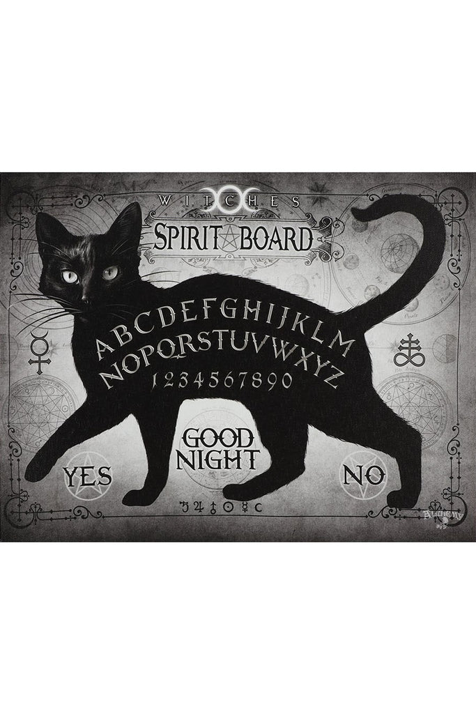 This small canvas plaque features the bewitching 'Black Cat Spirit Board' artwork by the popular Alchemy Gothic of London. This witchy, greyscale piece features a black cat with spirit board designs. 19x25cm.