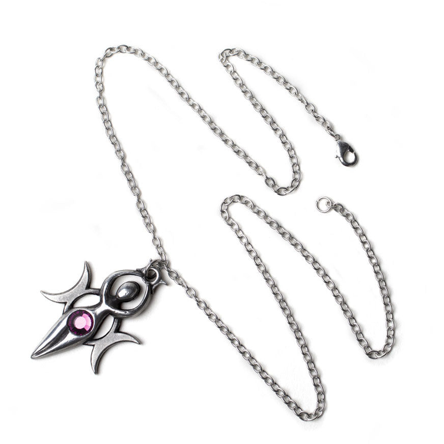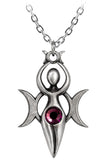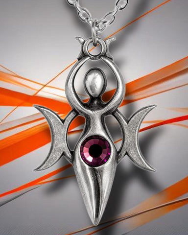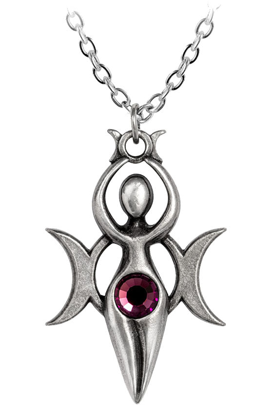 Mother of the earth and of all the gods! Matriarch to the legendary Celtic pantheon, the Tuatha De Danann, Danu, is goddess of fertility and wisdom. Wiccan symbology perfect for day to night wear. A triple Moon, Goddess Symbol perfectly handmade in fine English pewter. Enhanced with a stunning magical amethyst crystal from Austria.