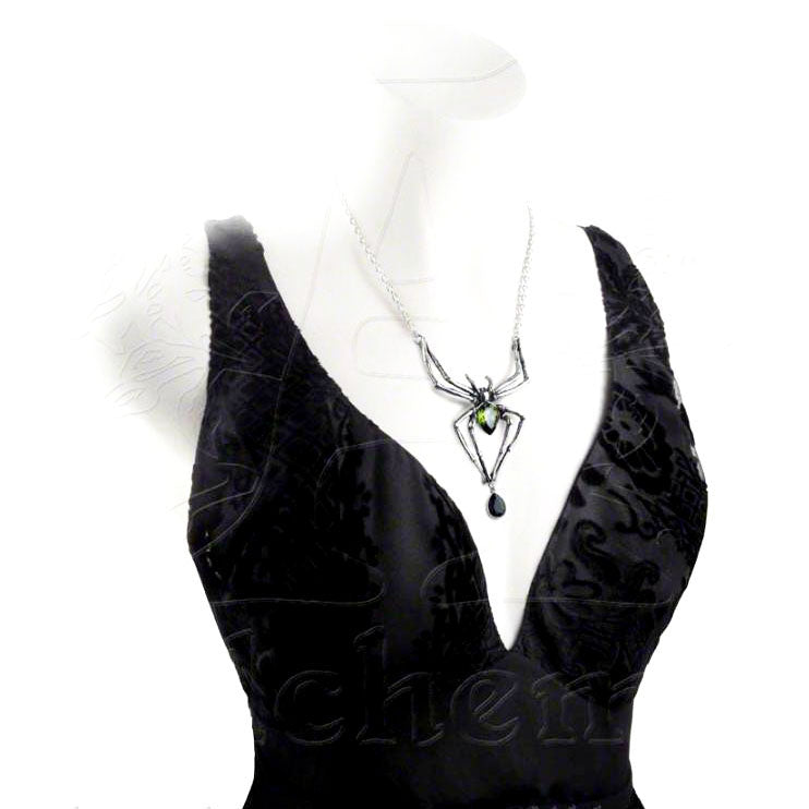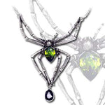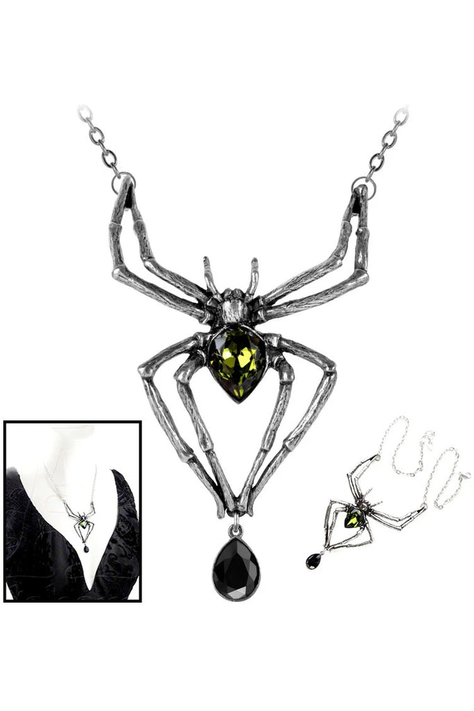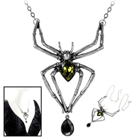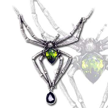 The deadly predator, poised to sink its irresistible fangs. An eye-catching necklace that will inject gothic drama into any outfit. A giant pewter spider necklace set with green and black Swarovski crystals. As worn by Alice Cooper.