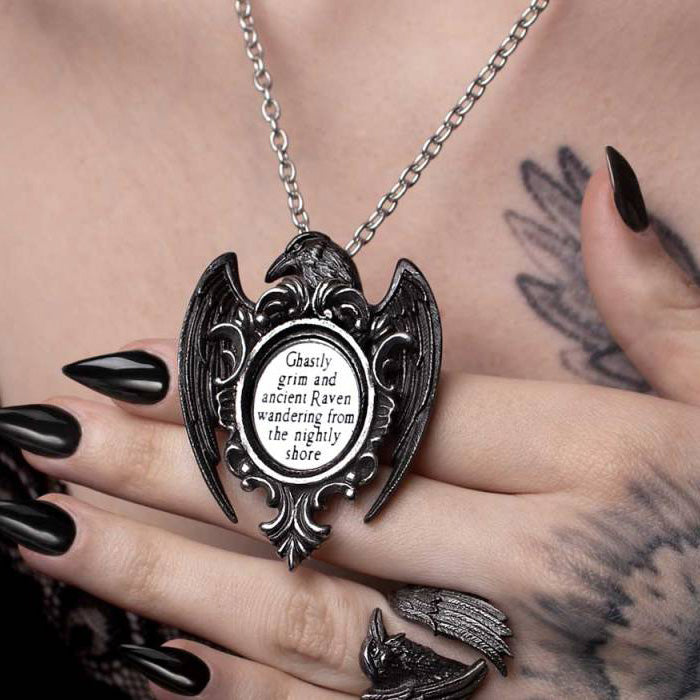 A herald from the welkin, in the depths of despair, dread the appalling spectre and its message from the underworld. A substantial pendant to add drama to any attire! An extraordinary pendant inspired the 'Edgar Allan Poe' poem, 'The Raven'. Inlaid with etched text mirror bearing words from the poem. The poem is decoratively framed in polished pewter and held by a contrasting black raven.