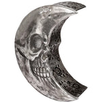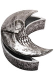 A moon shape casket with skull face. Hand finished, high quality poly resin.