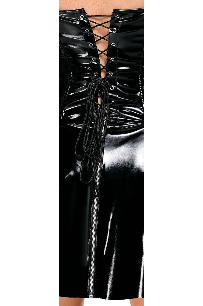 Material: The entire dress is made from high-shine black vinyl (100% polyester with a polyurethane coating), which is both durable and visually striking.