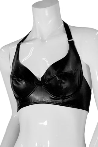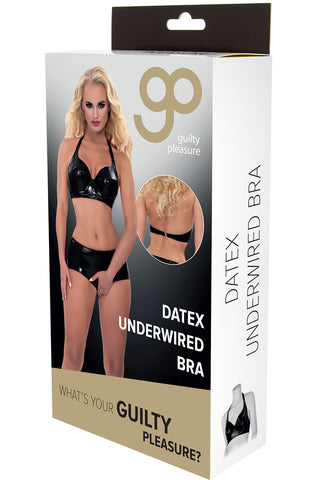 This classic bra combines the seductive look of latex with the comfort of fabric, thanks to its revolutionary Datex material. The Guilty Pleasure Datex Underwired Halter Bra features underwired cups and extra seams that ensure a great fit, making your breasts the center of attention.