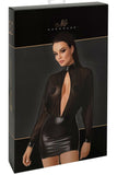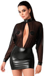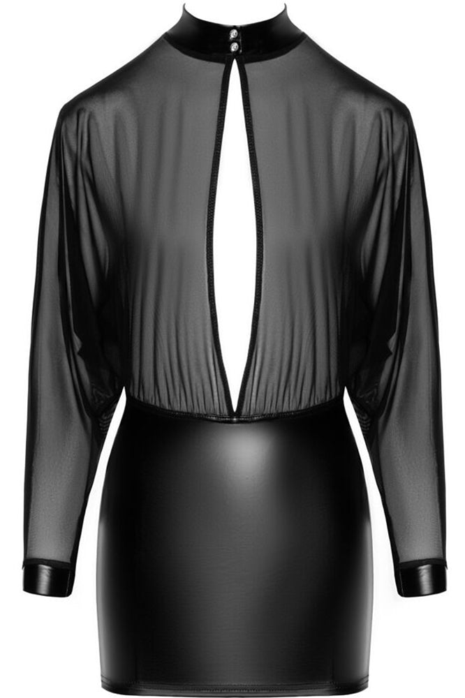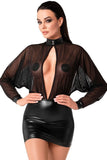 Stylish material mix! The black mini dress from Noir is made out of delicate transparent tulle (top part) and powerwetlook (skirt part). It is soft and stretchy for a very comfortable fit. The wide tulle top part has long batwing sleeves. It is low cut at the front and the back. The cuffs and stand-up collar (with press studs at the front) are made out of powerwetlook. The short, tight-fitting skirt part is also made out of powerwetlook.