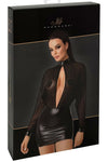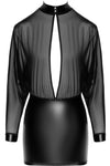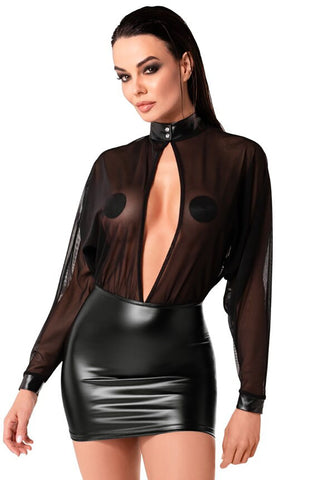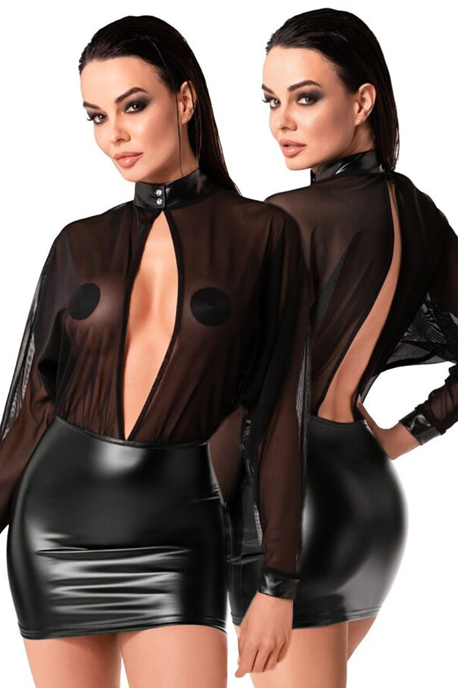 • Design: The mesh top features a snap-button collar and cuffs made from the same Wetlook fabric as the skirt, tying the two elements together. The open back and plunging front add an edgy twist to the elegant design, making it perfect for both daring outings and intimate settings.