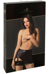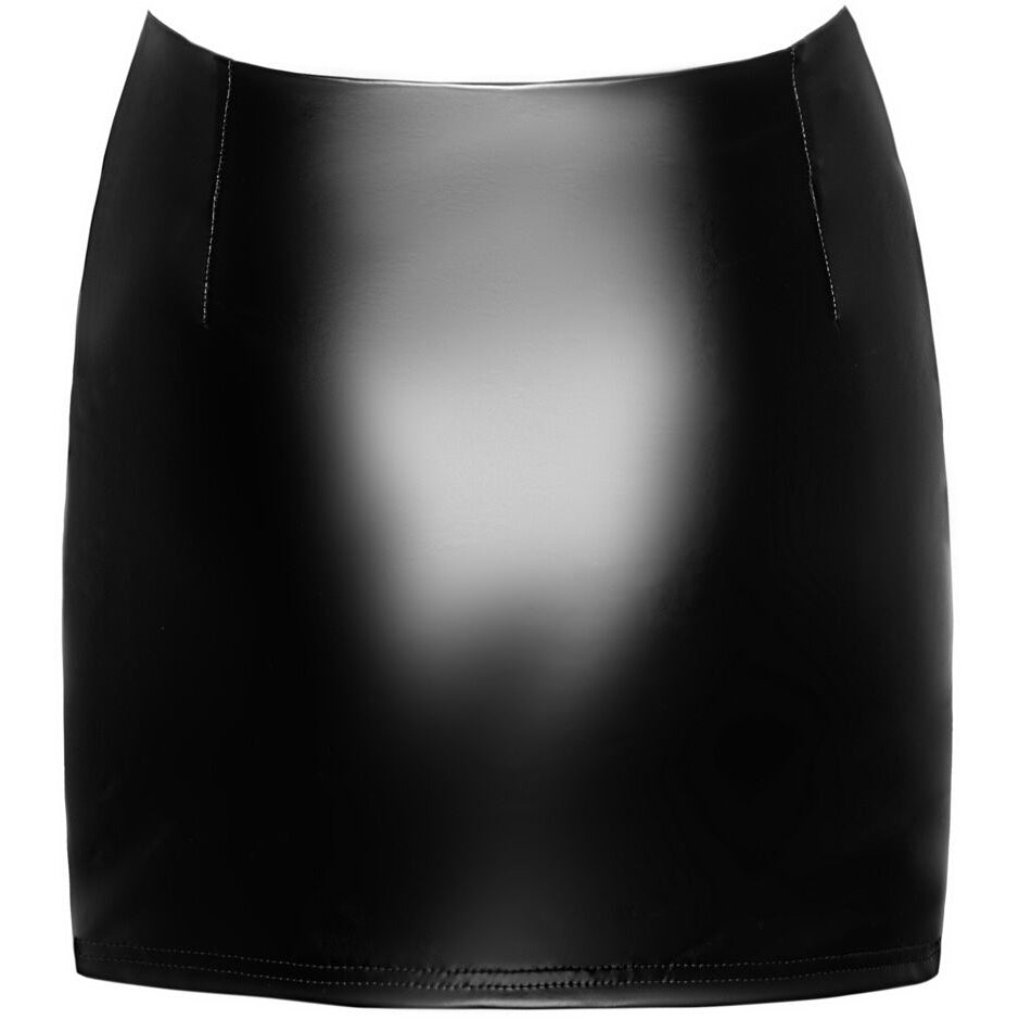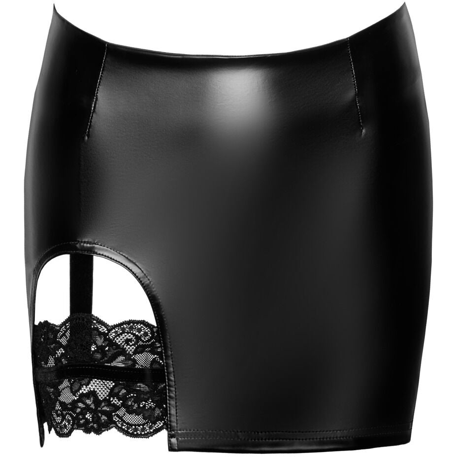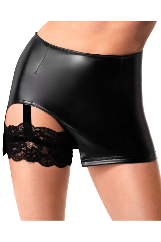 A seductive garter look! The tight mini skirt from Noir is made out of elegant powerwetlook. A large part of the hem is curved. The suspender strap with the lace garter is securely sewn onto the curved part of the hem. Everything is soft and stretchy for a tight but very comfortable fit.
