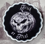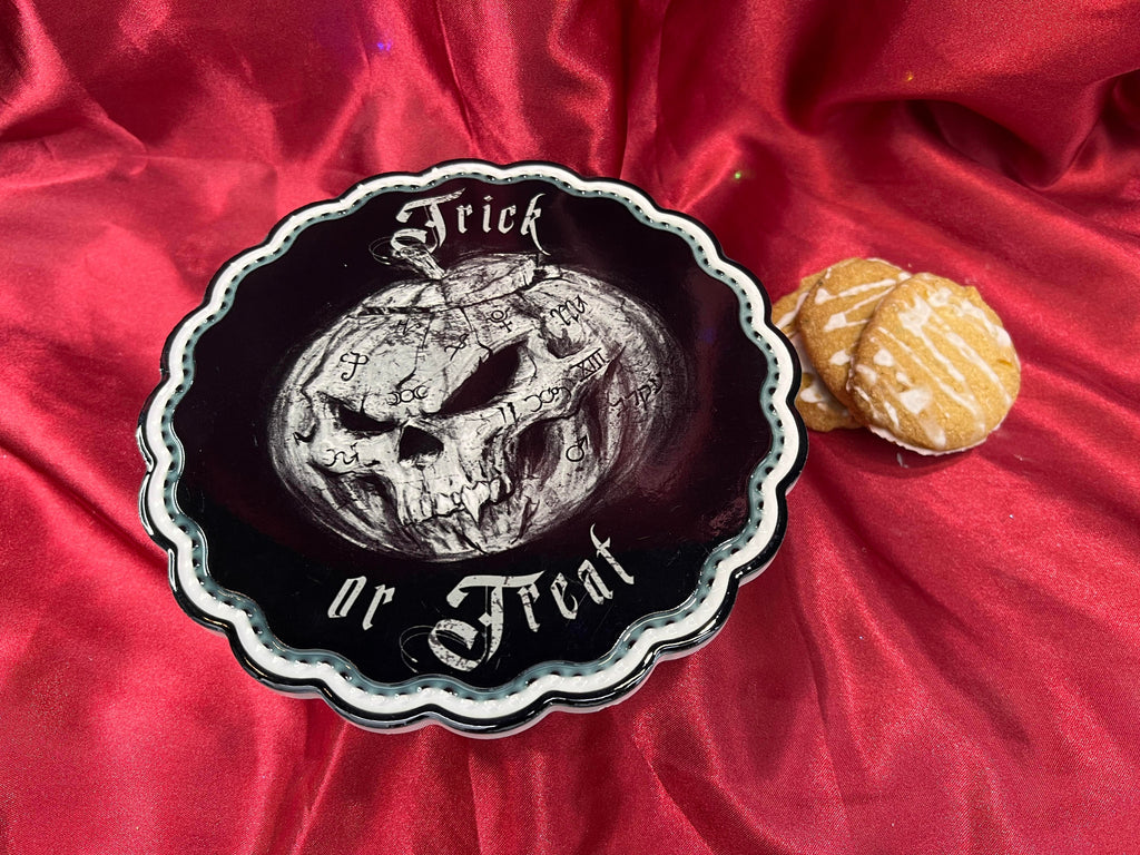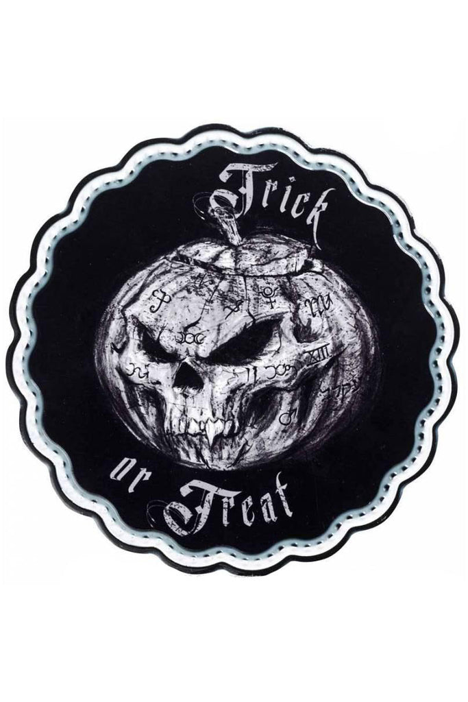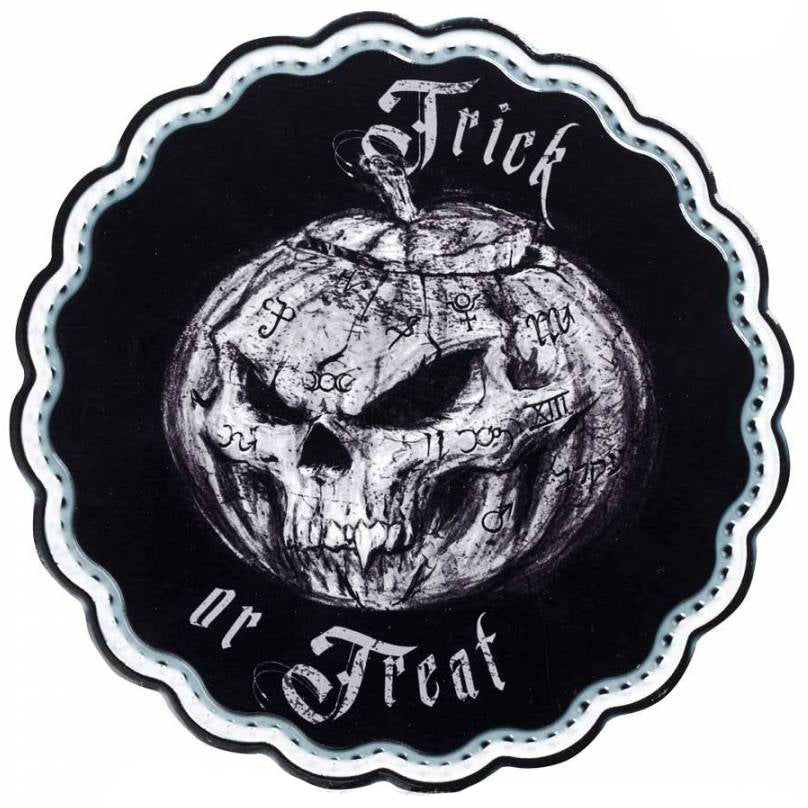 This 'Trick or Treat' trivet/ serving plate is not just for Halloween. Display treats all year round on this darkly beautiful piece. Hide the design beneath your favourite cake and once eaten this surprise pumpkin skull artwork will be the talking point amongst your guests!