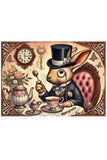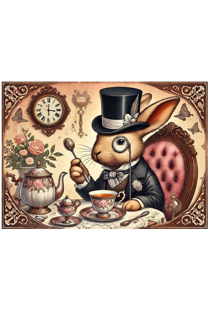 The beautiful orange design transports you to a bygone era, where a dapper rabbit, dressed in a sophisticated tailcoat, top hat, and bow tie, sits at a table with a teacup and teapot. With a stylish monocle completing its look, the picture is a charming blend of steampunk and Victorian whimsy.