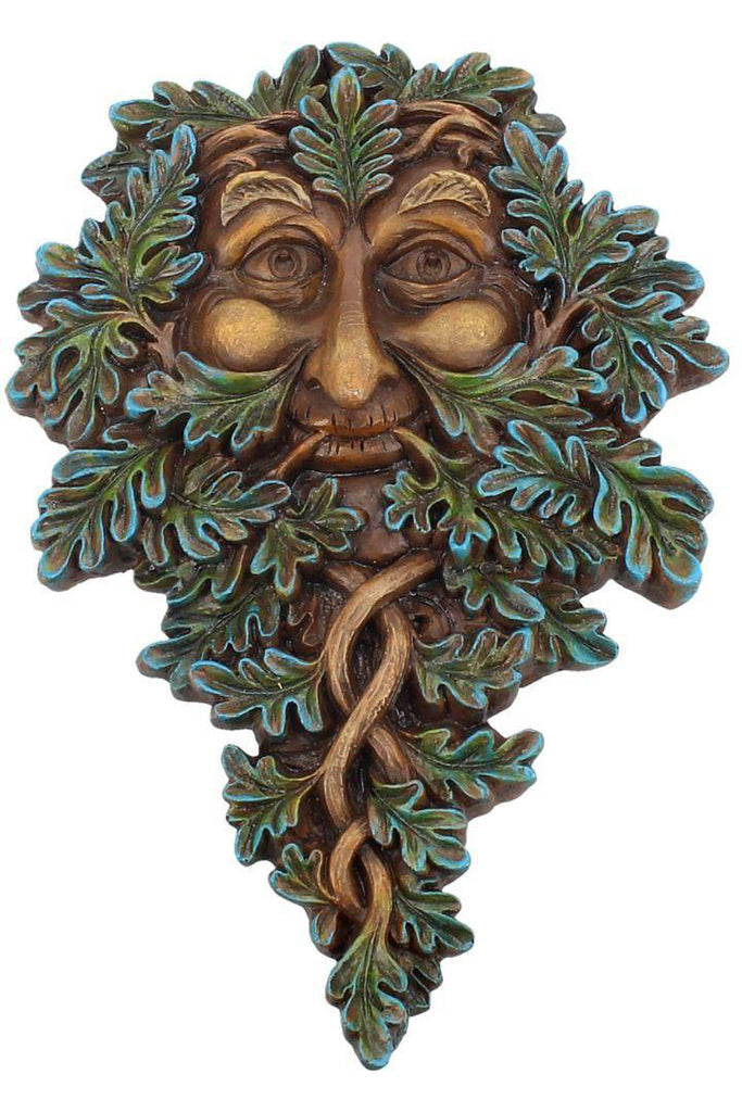 This beautiful round pagan wall plaque in green and brown tone resin is moulded to look like the face of tree spirit carved in wood, peering out from amid acorns and oak leaves with a coppery autumnal tone. The Plaque has a soft flocked backing and a fixing on the back to hang it on a wall.