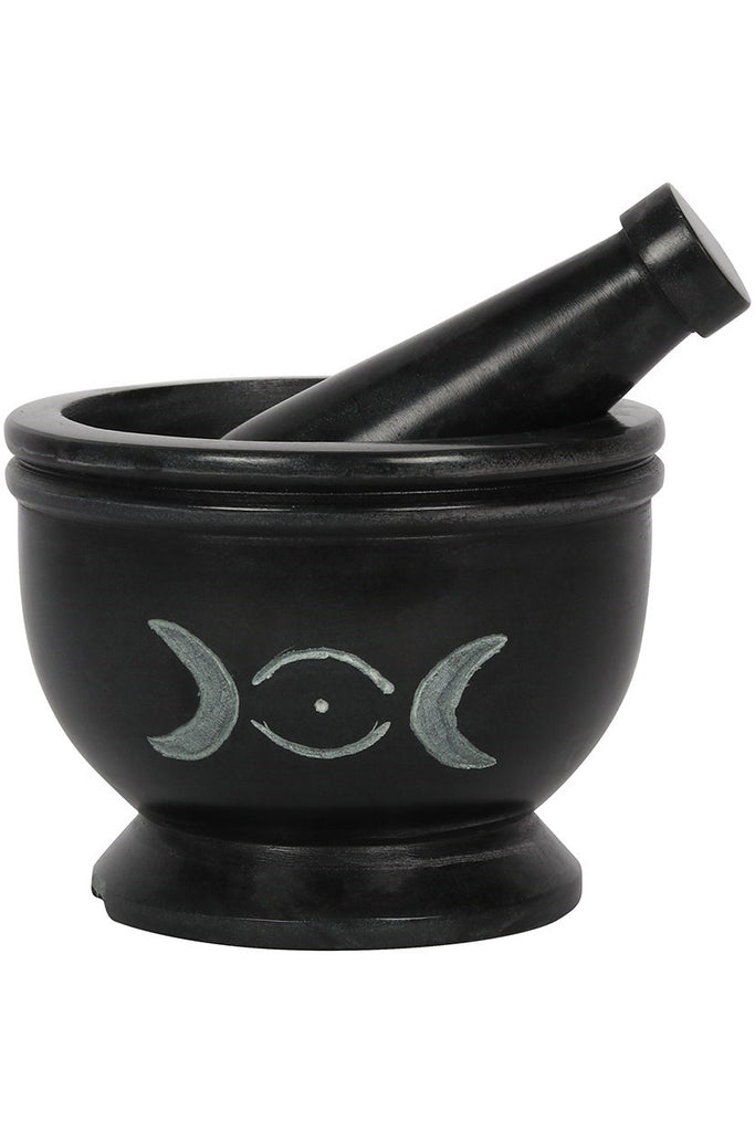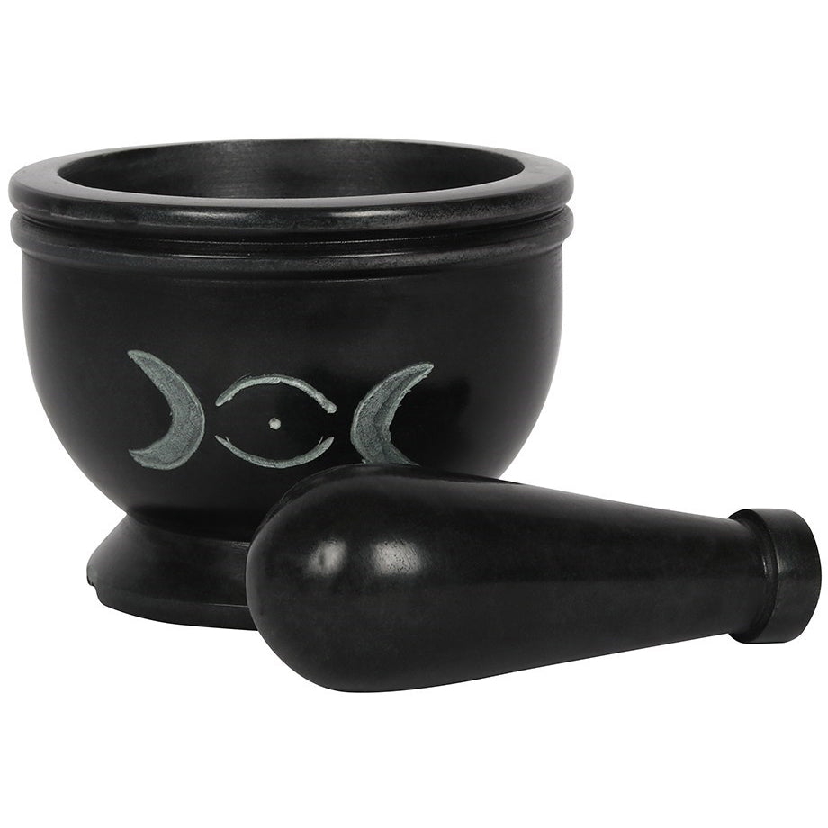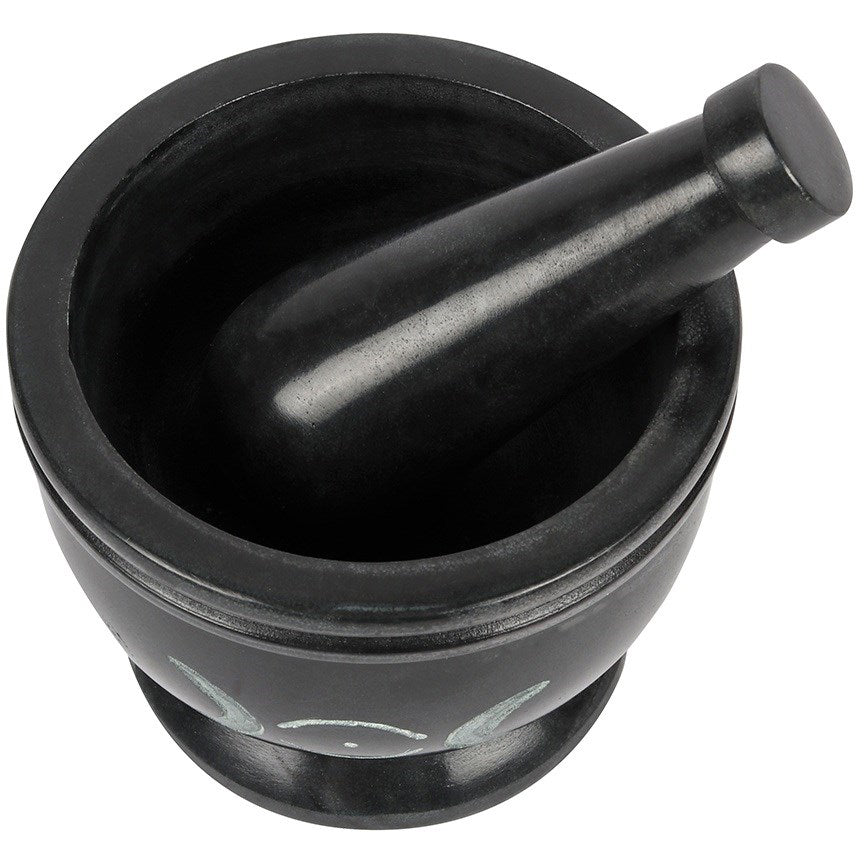 This carved soap stone mortar and pestle is an essential tool for crushing and grinding herbs in a variety of sacred rituals. This style is accented by a carved triple moon design on the side and is great for display or a witch's kitchen.