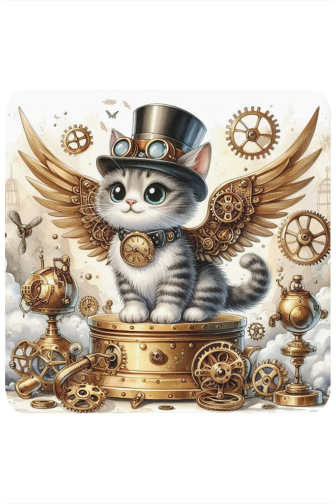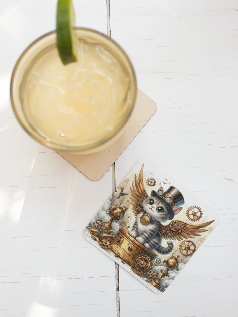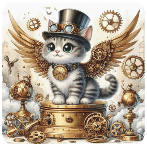 This cork-backed coaster features a captivating design of a black and white kitten, a curious inventor in its own right. The kitten is adorned with a detailed steampunk top hat, complete with goggles, and is ready for flight with its elegant brass steampunk wings. Around its neck, a unique collar holds a pocket watch, a testament to its mechanical prowess. The kitten is surrounded by a world of intricate steampunk contraptions and gears, bringing a sense of invention and wonder to every corner of your home.