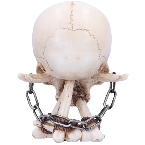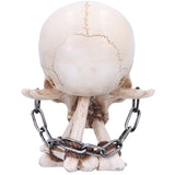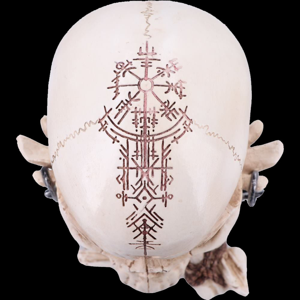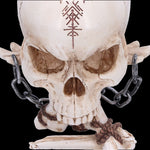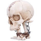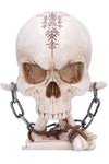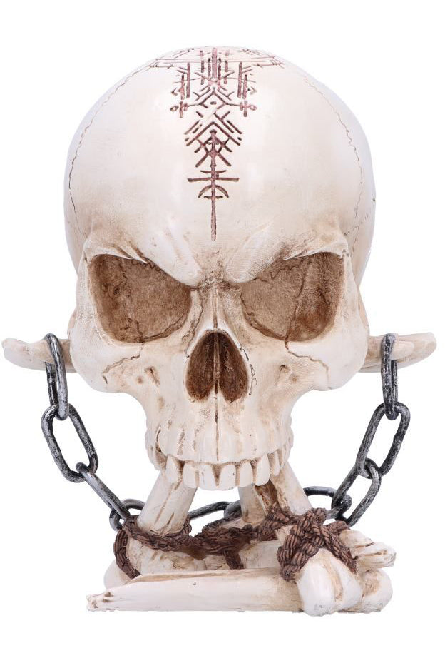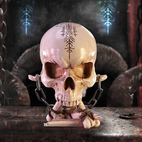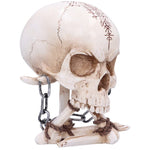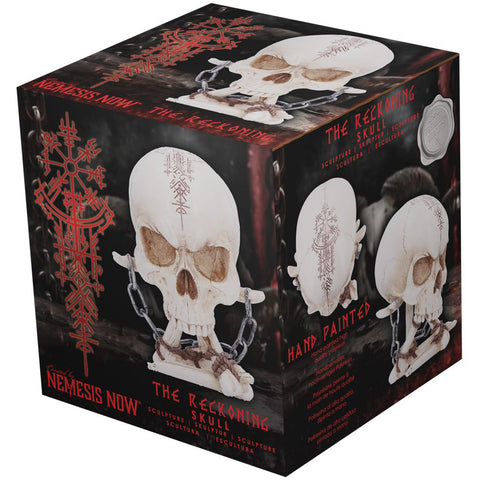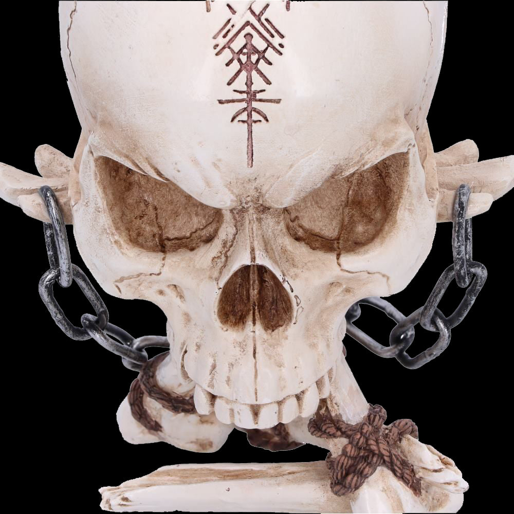 The Reckoning’ skull. Adorned with Satanic symbols atop, this haunting skull rests upon a macabre cross-shaped pile of bones, meticulously tied with ropes and chains, exuding an aura of dark allure and mystery. Cast in the finest resin before being expertly hand-painted, this piece is perfect for captivating enthusiasts of the occult and gothic aesthetics.
