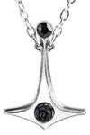 The pendant features a recognizable symbol of Norse mythology – Mjolnir, the mighty hammer wielded by the thunder god Thor. However, a striking black resin rose flower sits beside the hammer, adding a touch of unexpected femininity and softness. This juxtaposition beautifully represents the duality that exists within us all – strength and gentleness, power and grace.