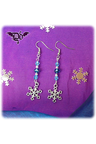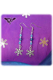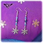 Dragophelion Designs Christmas Earrings. Pair of Hook Earrings featuring a silvertone snowflake charm on each earring dangling below turquoise AB and pale blue faceted glass crystal rondelle beads, sandwiched around two silvertone spacers. Great for adding a little festive sparkle to your Xmas party outfit!