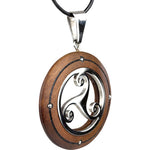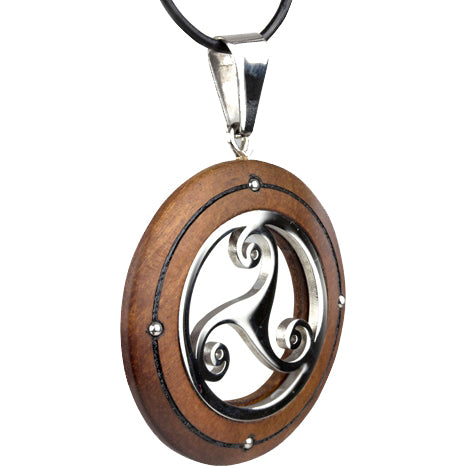 At the heart of this pendant lies the mesmerizing Triskel symbol, a Celtic emblem representing life, death, and rebirth. Its intricate stainless steel design is meticulously crafted, capturing the essence of this ancient motif with contemporary flair. The Triskel is beautifully encased within a handcrafted wooden frame, adorned with delicate grooves and secure rivets, adding a touch of rustic charm.
