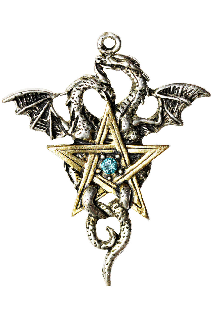 Intertwined in perfect harmony, the male and female dragons represent the polarity of the life force around the five elements of the Magickal Pentagram, forming a talisman for Balance and Stability.