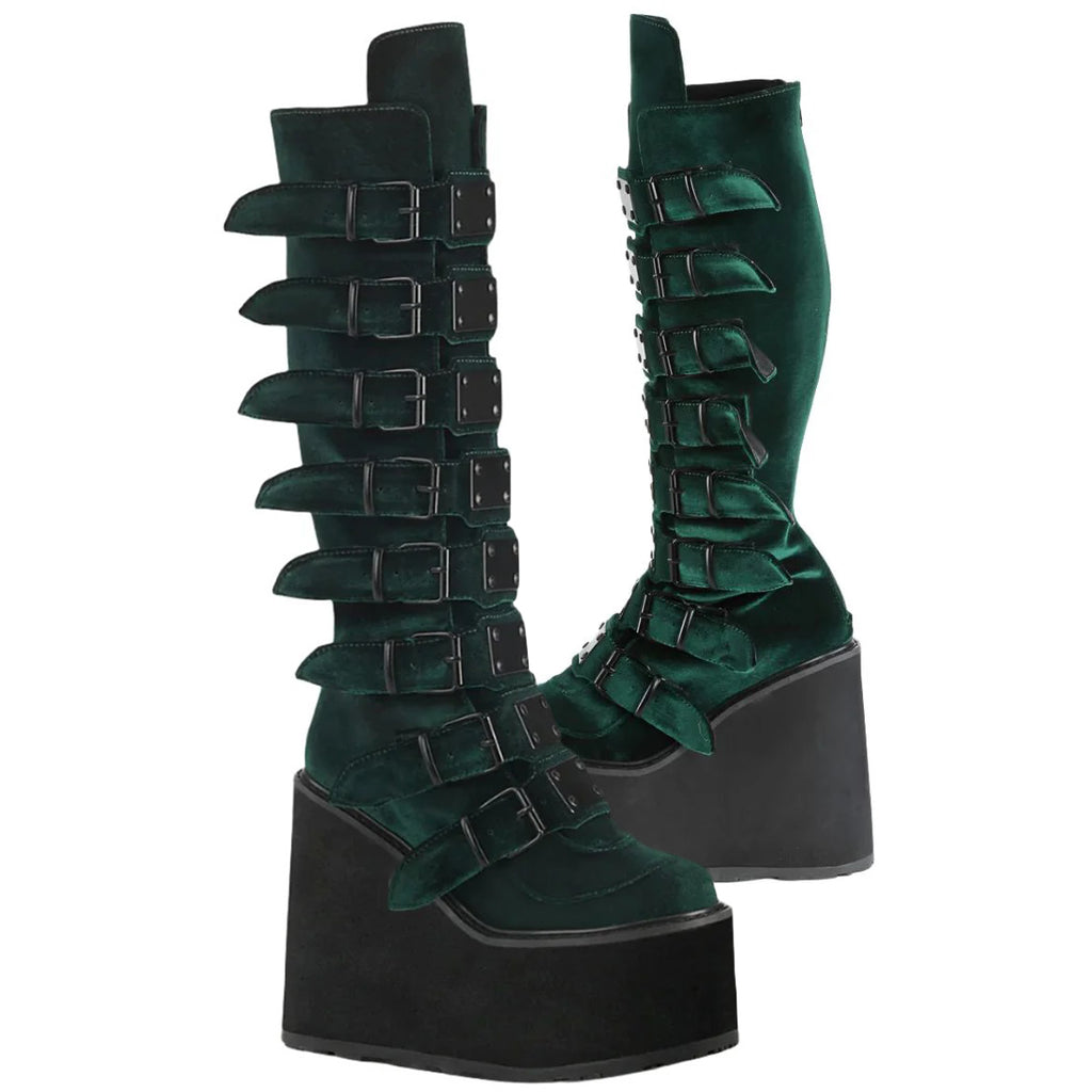 Step into a world of opulent rebellion with the DemoniaCult SWING 815 Emerald Velvet Boots. These extraordinary knee-high boots are a masterpiece of design, blending luxurious velvet with edgy punk aesthetics to create a truly captivating statement piece.