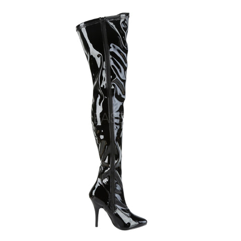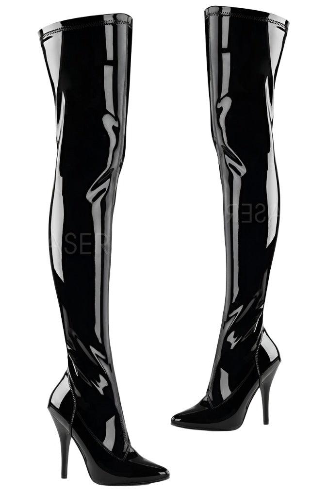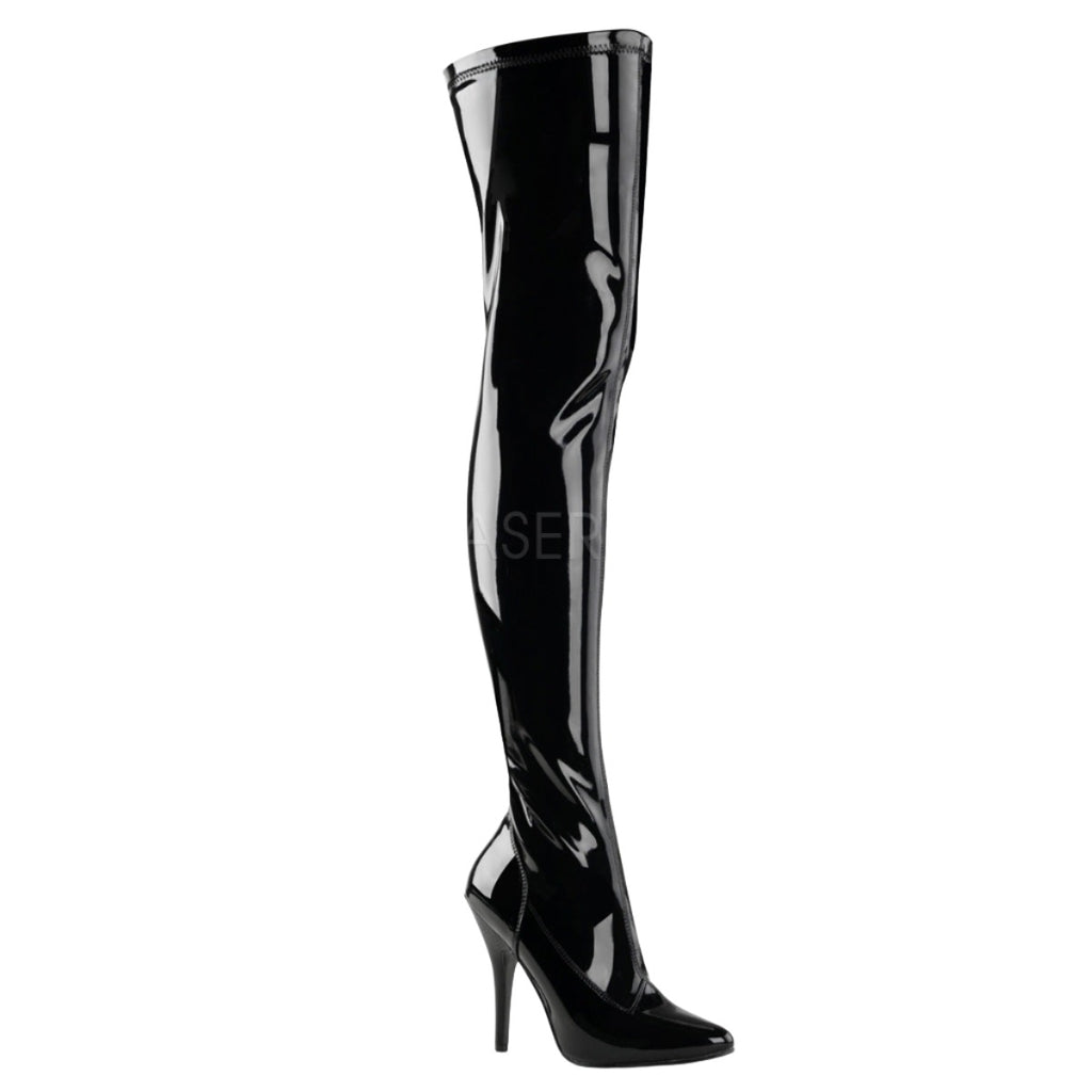 Embrace a sleek and sophisticated silhouette with the PLEASER SEDUCE-3000 Boots. These captivating thigh-high boots, available in a stunning matte or patent black finish, combine timeless design with a touch of modern edge, making them a versatile choice for any confident woman.