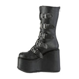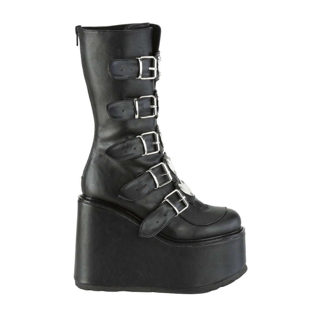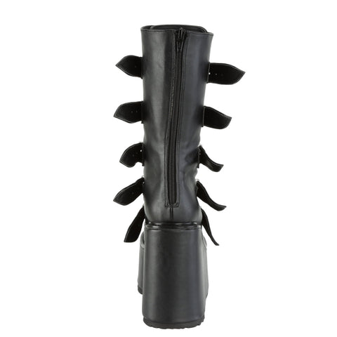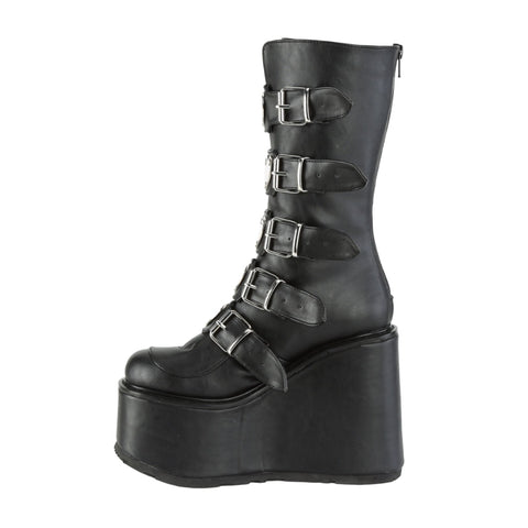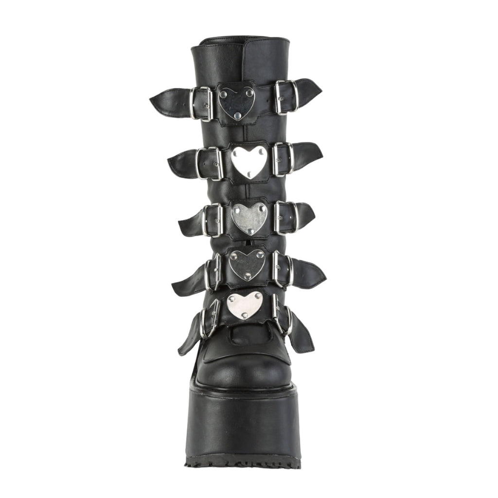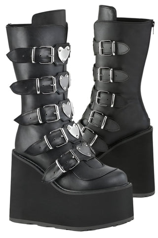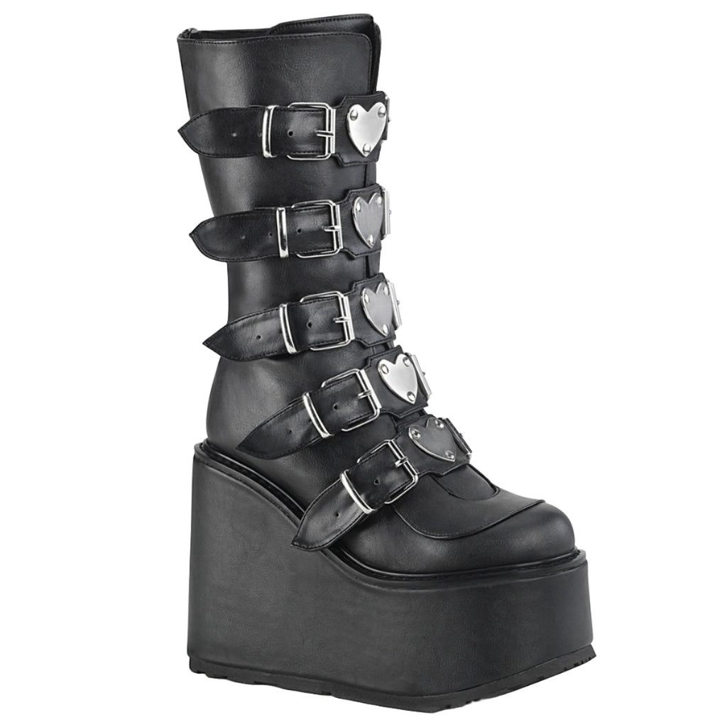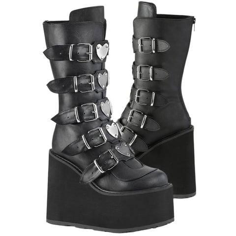 Rock Your World in Platform Love Boots. Inject a dose of edgy romance into your look with the DemoniaCult SWING-230. These mid-calf boots stand out with a head-turning 5.5-inch (140mm) platform sole that elevates your style and confidence. Crafted from black vegan leather, the SWING-230 features five buckle straps adorned with adorable heart-shaped metal plates at the center, adding a playful touch to your fierce footwear. A sleek back zip closure ensures easy on-and-off wear, making them perfect for nights out on the town.