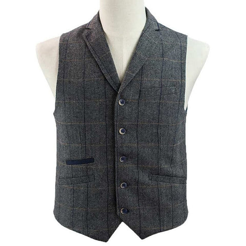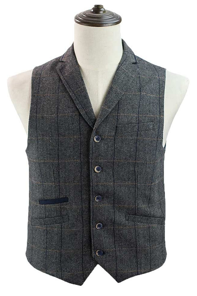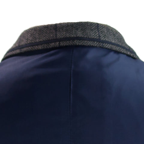 This classically stylish mens checked waistcoat in a grey tweed style fabric with lapels and collar is fully lined and has a pocket at each side and a chest pocket for hankie etc. The waistcoat has a navy blue back panel with buckle adjuster strap. The front fastens with buttons. An ideal finishing touch to any Steampunk Gentleman's outfit!