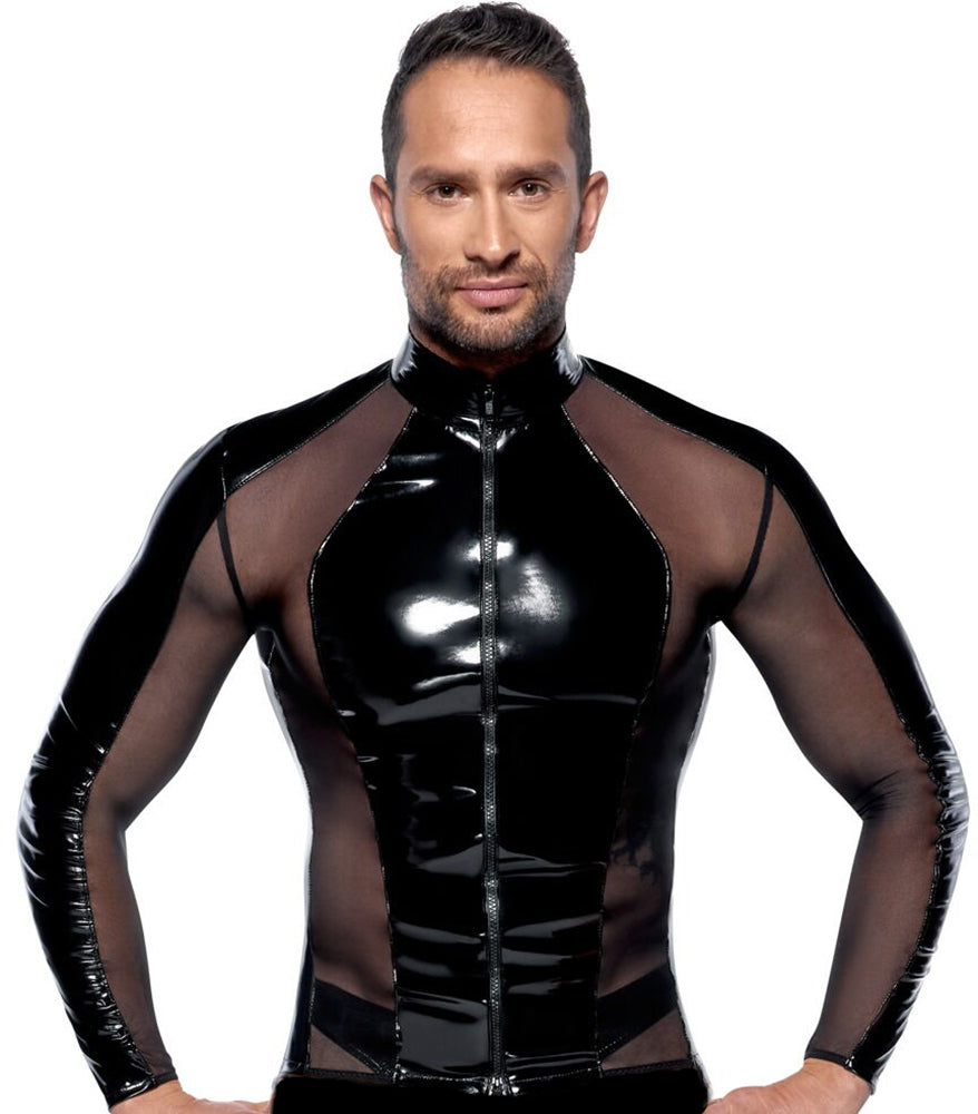 • Unique Material Mix: The shirt is crafted from a mix of shiny vinyl (100% polyester with a polyurethane coating) and transparent, stretchy mesh (98% polyamide, 2% spandex). This material blend fits close to the skin, creating an alluring contrast and ensuring high comfort.