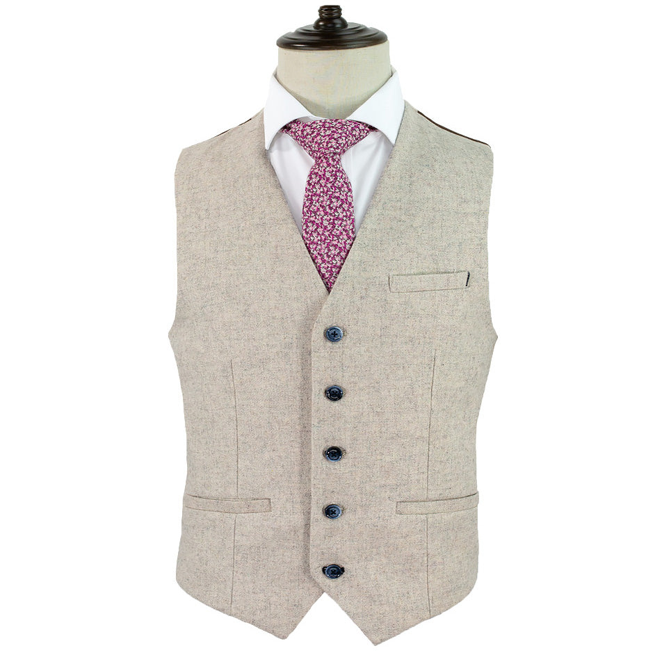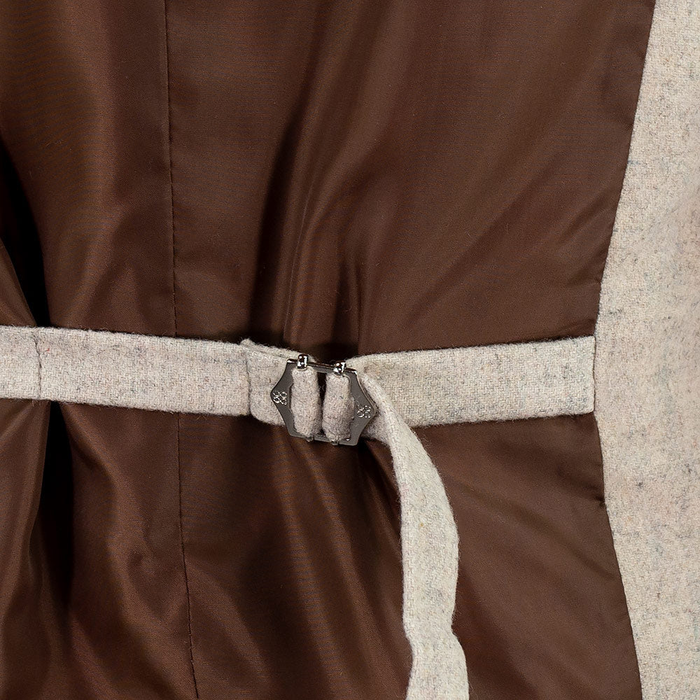 This classically stylish mens waistcoat in a cream tone 50% Wool blend fabric with lapels and collar is fully lined and has a pocket at each side and a chest pocket for hankie etc. The waistcoat has a brown back panel with buckle adjuster strap. The front fastens with buttons. An ideal finishing touch to any Steampunk Explorer's outfit!