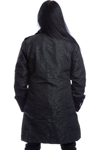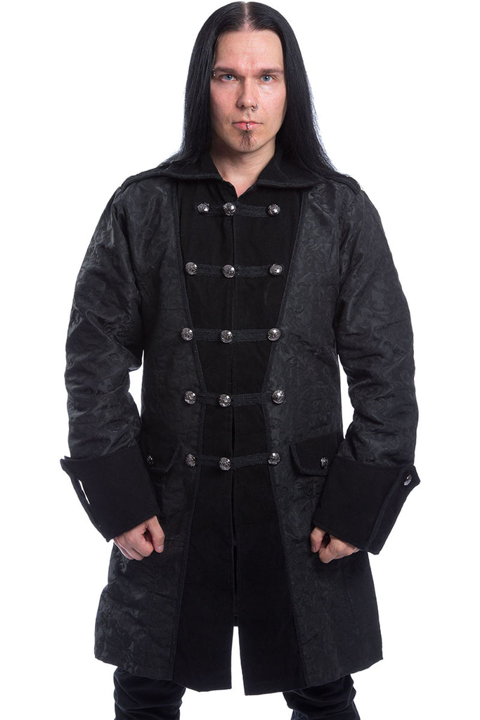 Mens Frockcoat style jacket in black brocade with plain black contrast panels on the centre front, collar, cuffs and pocket flaps. Military style braid bands and centre front decorative and fastening buttons on the front.