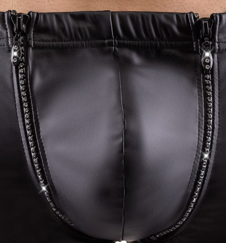 Sparkly rhinestone zips around the crown jewels! The figure-emphasising black pants from Svenjoyment are in a trendy matte look. The pants cling to the body in a sexy way. There is a padded rhinestone zip at either side of the pouch. The zips can be unzipped so that the pouch can be folded down. The pants are soft and stretchy for a very comfortable fit.