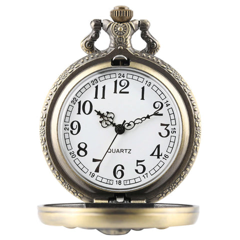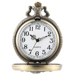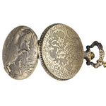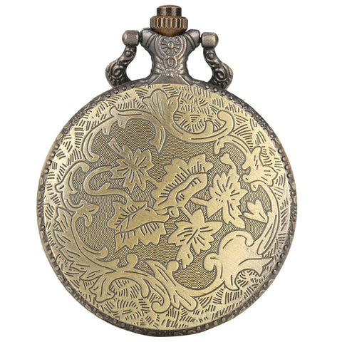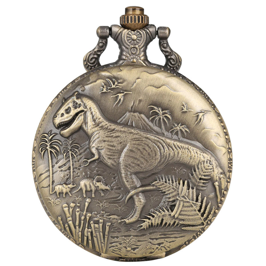 Antique Bronze Effect Steampunk Pocketwatch with Dinosaur design on the front casing and floral pattern on the back.