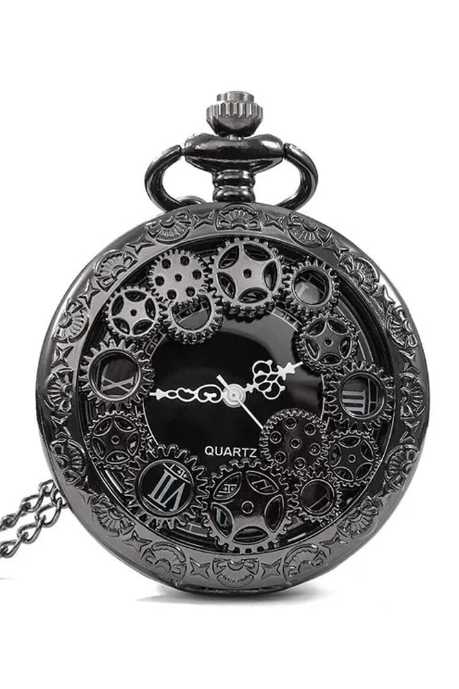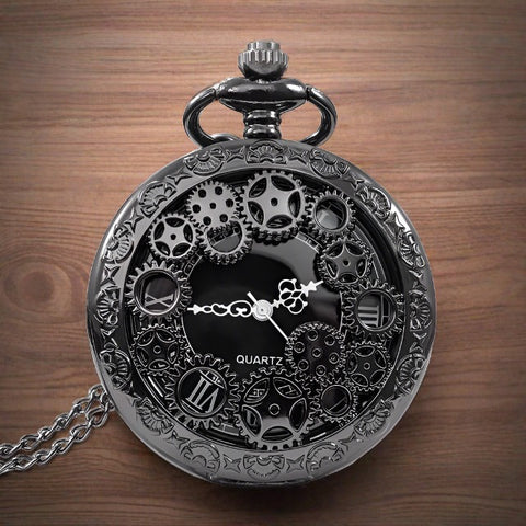 Find Steampunk Pocket Watch. Black Gunmetal Effect Steampunk Pocketwatch with Cogs and Gears design on the front casing.
