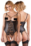 We've expertly crafted this body with a slightly padded shelf bra that has a secure hook fastener at the back, providing comfortable support without compromising its delicate design. Dainty strap details and sparkling rhinestones in the cleavage area add a touch of glamour. The semi-transparent lace inserts at the front create a sense of mystery, while refined lacings with silver rings and stretchy straps provide an extra layer of allure.