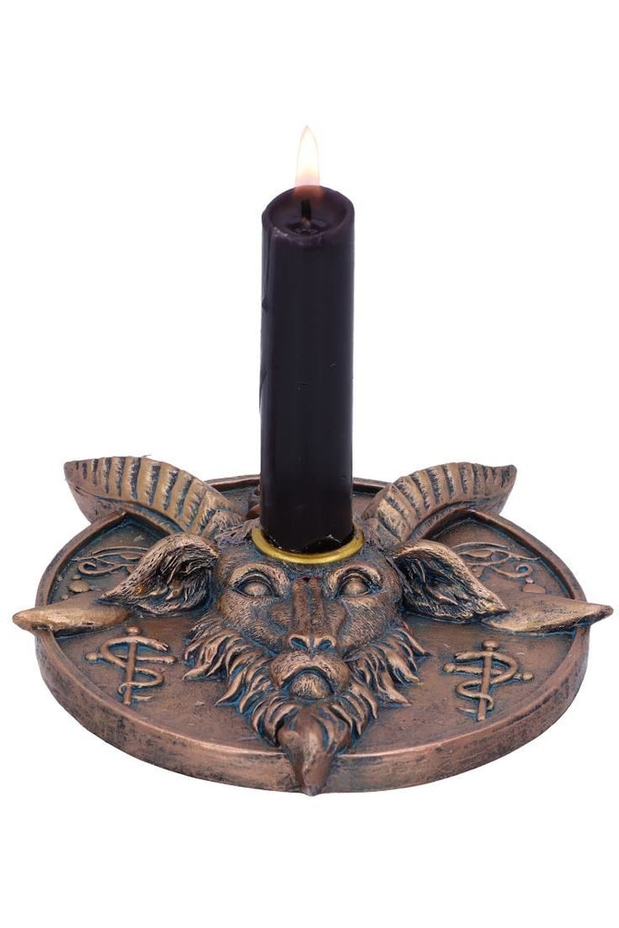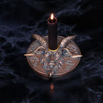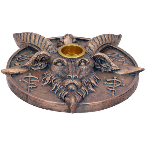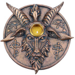 Expertly crafted Baphomet Incense burner and candle holder. Adorned with the face of the mighty Baphomet, this small circular holder also features the Staff of Asclepius and the eye of Horus. In the centre of the Baphomet's head, there is a small dish where you can place your favourite candle and a small hole to burn your incense sticks. Cast in the finest resin before being expertly hand-painted, this piece is perfect for those who wish to invoke the Baphomet to bring balance to their lives.