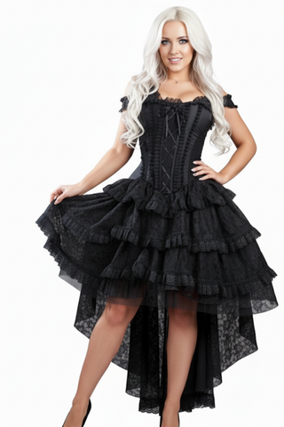 This is a Beautiful Gothic Dress in black taffeta with a cascading black lace waterfall skirt section and corset lacing through fifteen pairs of eyelets at the back. There is a modesty panel measuring 4.5 inches (12cm approx). The corseted bodice has four steel bones at the front and steel Binding supports at back.