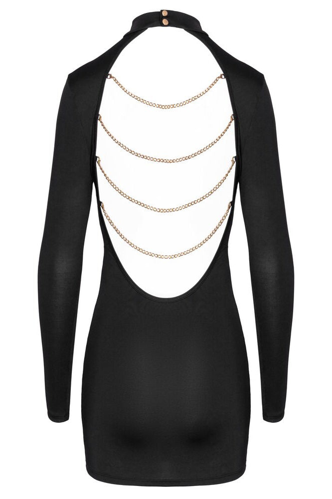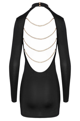 Elegant at the front, exciting at the back! This black mini dress from Cottelli PARTY has long sleeves and is in a tight-fitting design. It has a large breathtaking cut-out at the back with 4 gold-coloured chains over the uncovered back. The chains can be removed. The stand-up collar can be fastened with its 2 gold-coloured press studs at the back of the neck. The delicate stretchy material is soft and clings sexily to the body, making it comfortable to wear and move about in.
