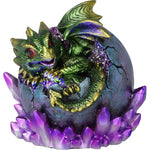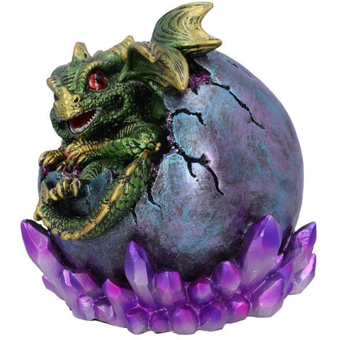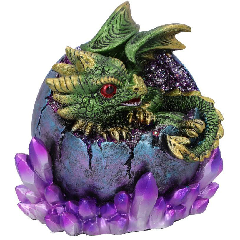 Watch as this wide-eyed creature emerges from its shell into this unfamiliar world. Featuring bright-green scales with golden accents on their claws, horns and wings, this enchantingly adorable dragon is looking into the world for the first time from its metallic purple home. Cast in the finest resin before being expertly hand-painted, this is the ideal gift for any lover of mythical beasts!