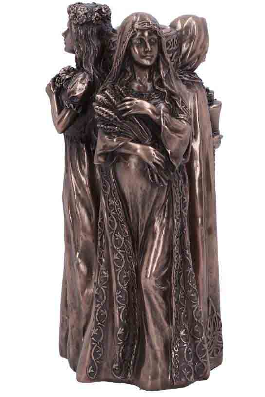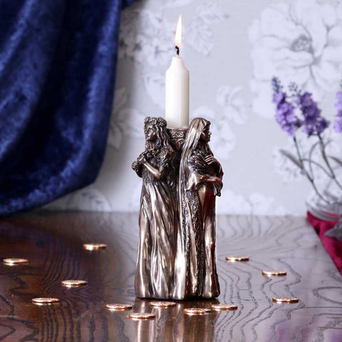 Cast in the finest resin before being given a bronze finish and painstakingly hand-painted. Three women of different ages stand with their backs to the base of the candle holder. Which at the top contains a small tray, suitable for holding your favourite scented candlesticks. Symbolizing the circle of life, this candle holder pays tribute to Wiccan and Pagan beliefs. Making this candle holder the perfect addition to any alternative gift store.