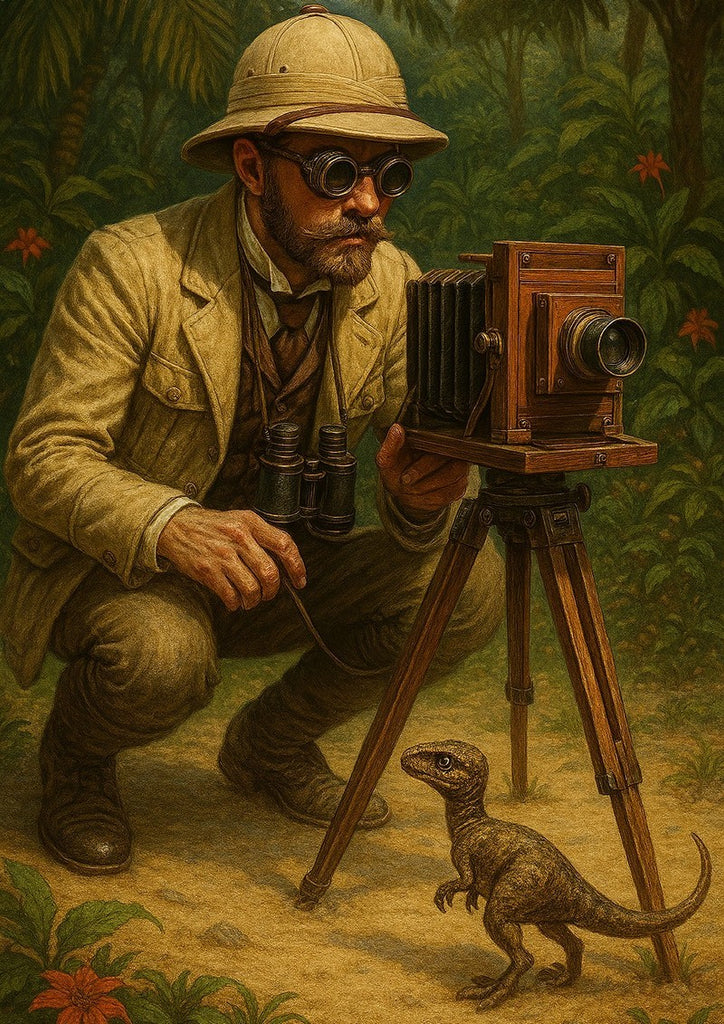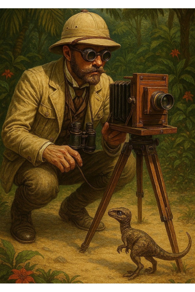 This Oakhart Industries art print, "A Shot in Time," captures the spirit of exploration and adventure in a fantastical, steampunk-inspired world. The painting features a man with a beard and mustache, dressed in a classic explorer's suit with a pith helmet and goggles, as he crouches to operate a large, old-fashioned wooden camera. Around his neck, a pair of binoculars suggests his keen interest in his surroundings.