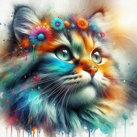 This magical portrait captures the whimsical spirit of a cat in a stunning, expressive style. With its fur a vivid tapestry of warm oranges and cool blues, this feline looks at the world with a sense of childlike wonder. Adorned with a vibrant crown of flowers, it embodies a gentle, bohemian charm. The watercolor-inspired art style, with its playful drips and splashes of color, creates a dreamy and imaginative scene. This image is more than just a picture; it's a piece of art that invites you to see the world with curiosity, beauty, and a splash of color.