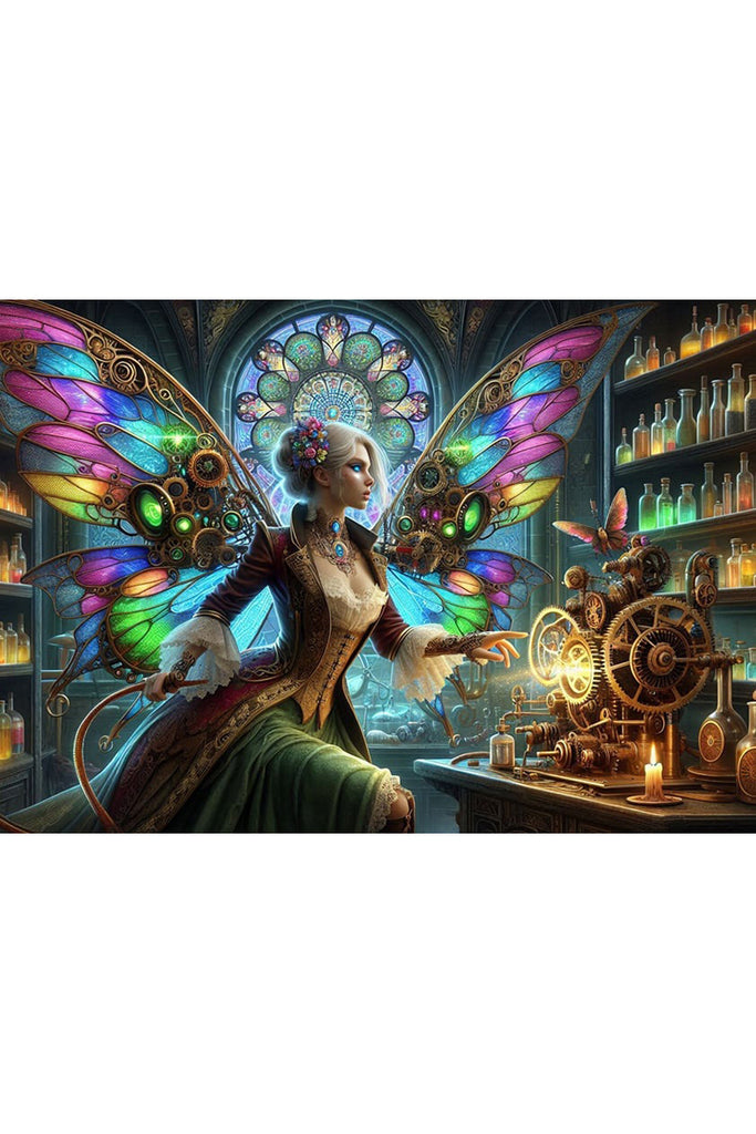 The central character is an elegant tinker-fae with large, intricate butterfly wings that mimic the luminous quality of stained glass. She is captured in the heart of her creative space—a detailed alchemist's or tinkerer's workshop. The shelves around her are filled with glowing glass bottles, suggesting her mastery of enchanted elixirs and potent concoctions.