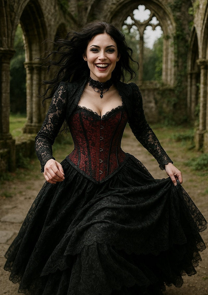 Celebrate the joyful and dynamic side of gothic culture with this stunning art print from Oakhart Industries. The piece captures a moment of unbridled joy, featuring a lady with long, dark hair caught in a lively pose, holding up a full, layered black lace skirt as she runs. The wind animates her hair, adding to the sense of movement, while a genuine smile and direct gaze at the viewer create an immediate, personal connection.