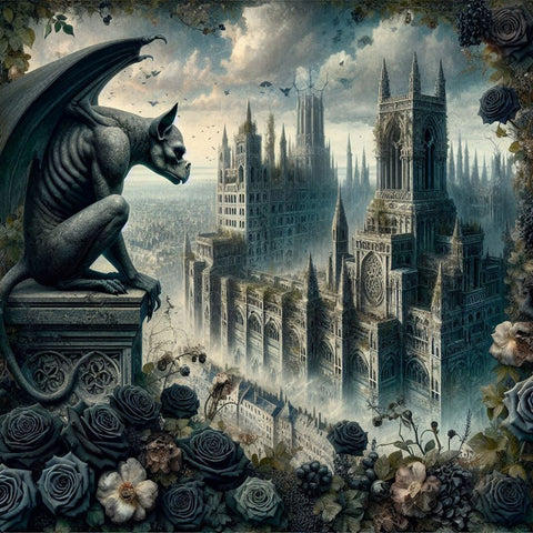 "The Last Sentinel" isn't just an image; it's a window into a story. The centrepiece, a solitary skeletal gargoyle with immense, bat-like wings, perches on a crumbling spire. Its gaze is fixed on the immense, fog-kissed cathedrals and spires below, a city dominated by gothic architecture and flying, shadowy creatures.
