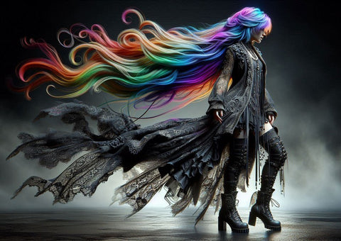 Step into a world of mysterious power and vibrant color with The Rainbow Weaver Print. This fantastical and gothic-style piece features a solitary female figure, her most striking feature being a cascade of long, flowing hair that is a vivid spectrum of rainbow colors—pinks, oranges, yellows, greens, blues, and purples—creating a powerful contrast to her dark attire.
