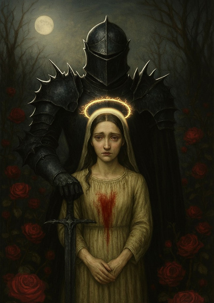 This Oakhart Industries art print, "The Shadow and the Saint," is a powerful and somber work that explores the themes of darkness and protection. The image presents a striking juxtaposition of two figures. In the foreground, a solemn young woman, a "saint," is in distress, with a halo of golden light above her head. She wears a simple, light-colored dress with a prominent dark red stain on her chest, hinting at sacrifice or a deep wound.