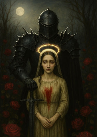 Behind her stands a towering, imposing figure—a "shadow"—in full, spiky black armor. This dark knight's featureless helmet and large, two-handed sword planted in the ground beside the woman create an intimidating yet protective presence. The scene is set in a decaying rose garden filled with twisted, thorny trees and vibrant red roses, all bathed in the pale light of a full moon. This print is a compelling narrative of dark fantasy, protection, and sacrifice, ideal for those who appreciate moody and atmospheric art.