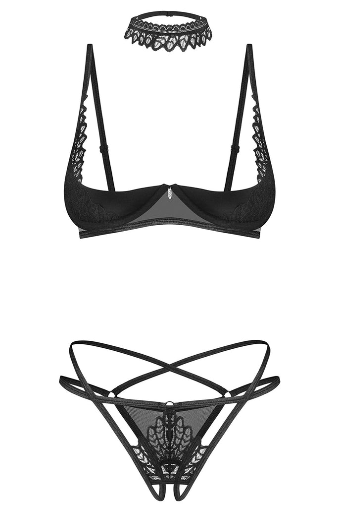 - Sensual underwire bra and open G-string, including an elegant choker