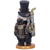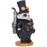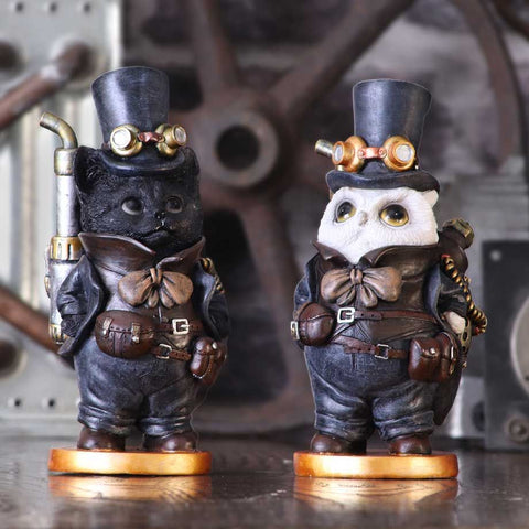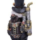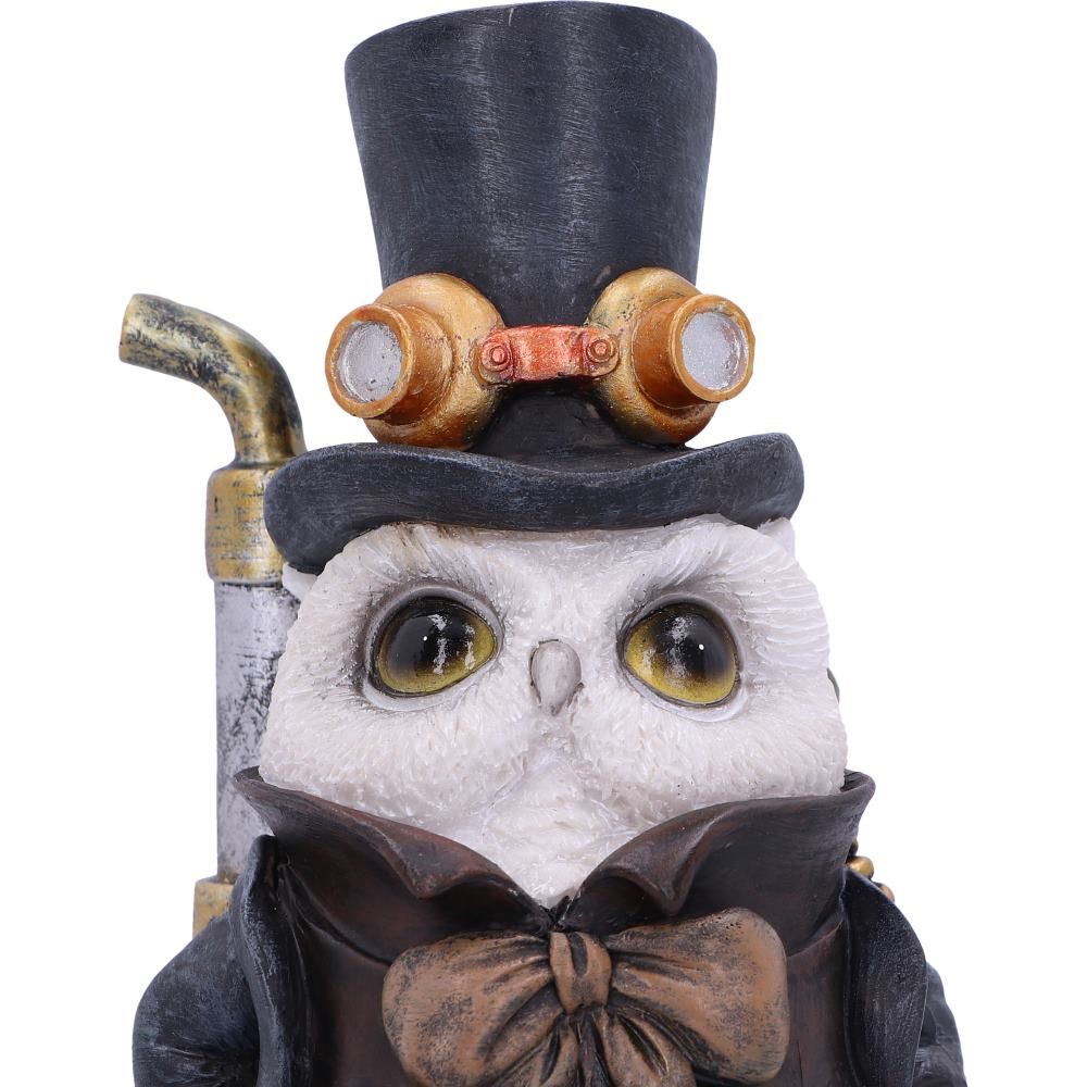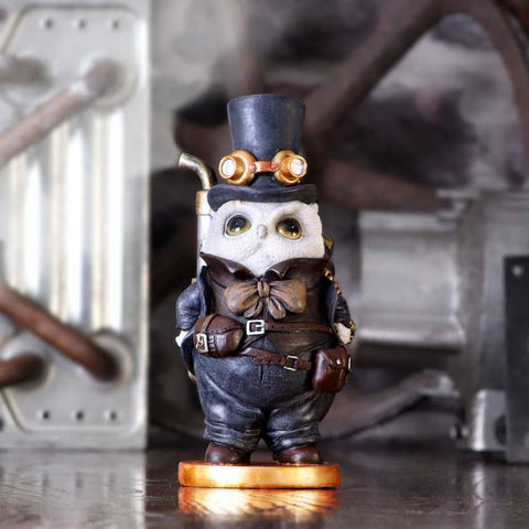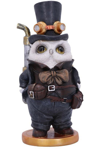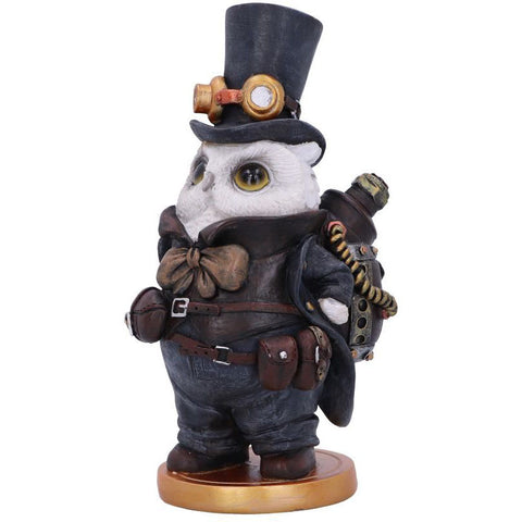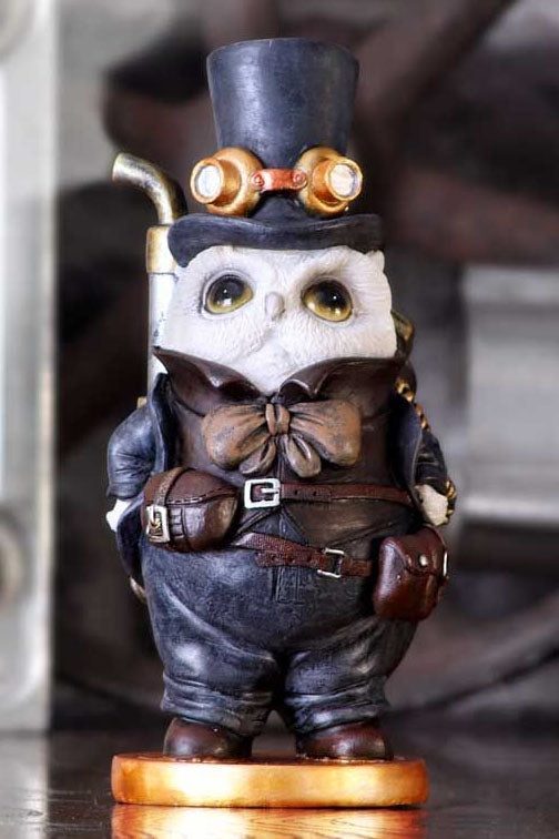 Ready for adventure this owl stands proud and wide eyed, dressed in a top hat with gold goggles, a leather waistcoat, drooped bow tie and leather belts with compartments to store equipment. On his back his back he carries his apparatus which is covered in gears and rivets. Cast in the finest resin before being expertly hand-painted, this Owl would make the perfect addition to any Steampunk collection.