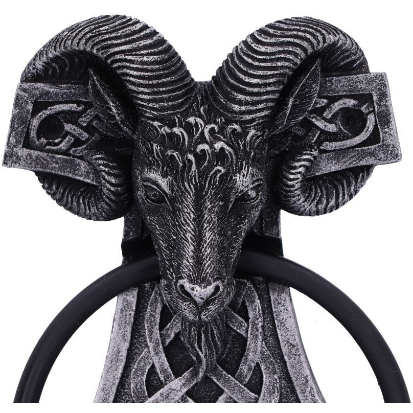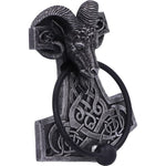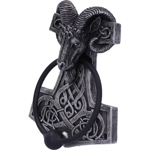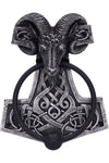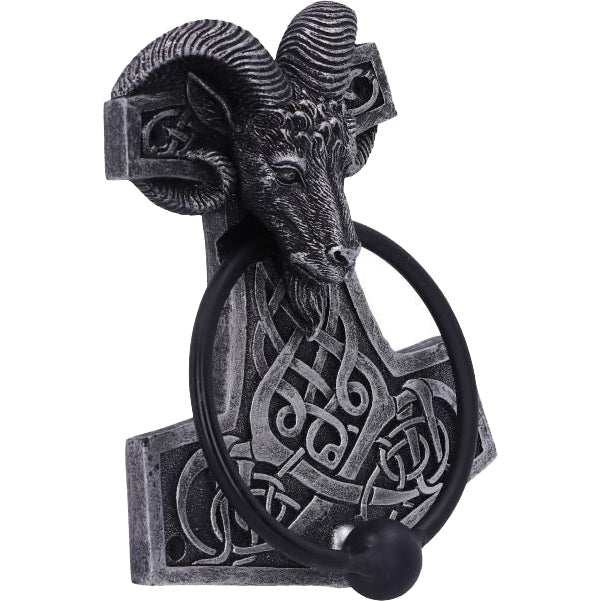 The hammer of the thunder god, Thor, used as a deadly weapon and also as a way of providing blessings. The hammer was also worn as a pendant to those living in the Viking Age in the Scandinavian culture and in modern times to adherents of modern Heathenry. The head of a ram, horns curled around the top of the hammer holds the door knocker in its mouth. The knocker part is a solid metal ring, weighted to provide a loud knock. This Thor’s Hammer Door Knocker would make the perfect addition to any lover of the Viking Age.