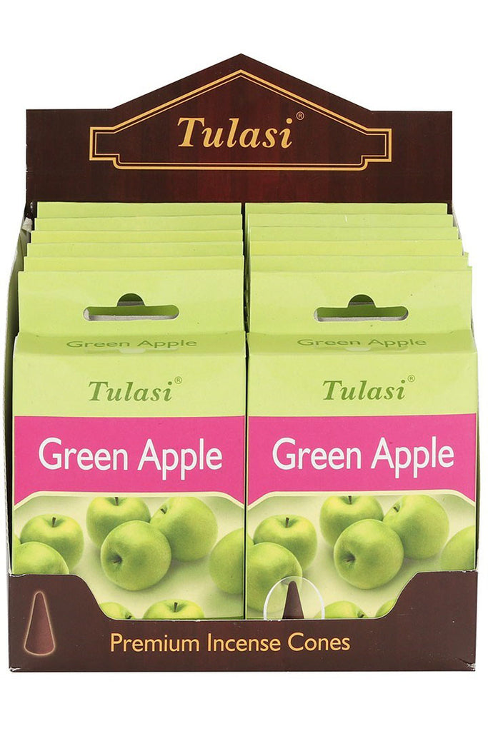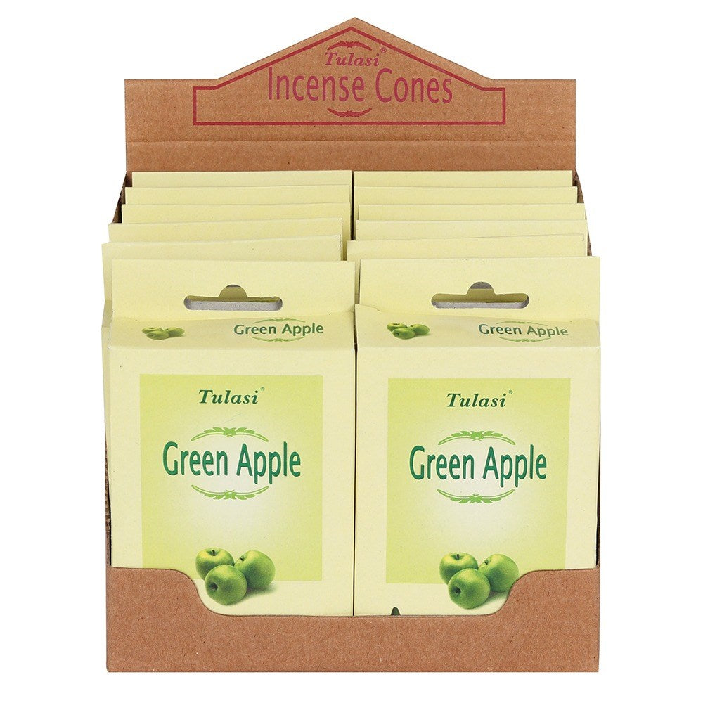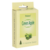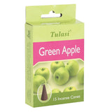 Tulasi Green Apple incense cones. Each pack contains 15 incense cones and one metal holder.