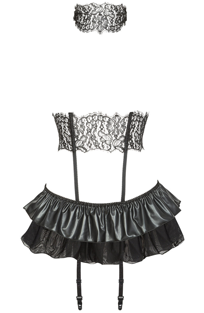 Discover an exclusive and intensely sexy look with the Beauty Night Berenice Set, a three-piece ensemble designed for a truly unforgettable impression. The set features a short corset made from beautiful lace, which is laced at the back with a black satin ribbon for a customizable fit. This corset is joined by vertical straps to a skirt crafted from shiny elastic material and delicate tulle, which also functions as a garter belt. The same stunning lace pattern appears on the included matching mask, and a thong completes the set.